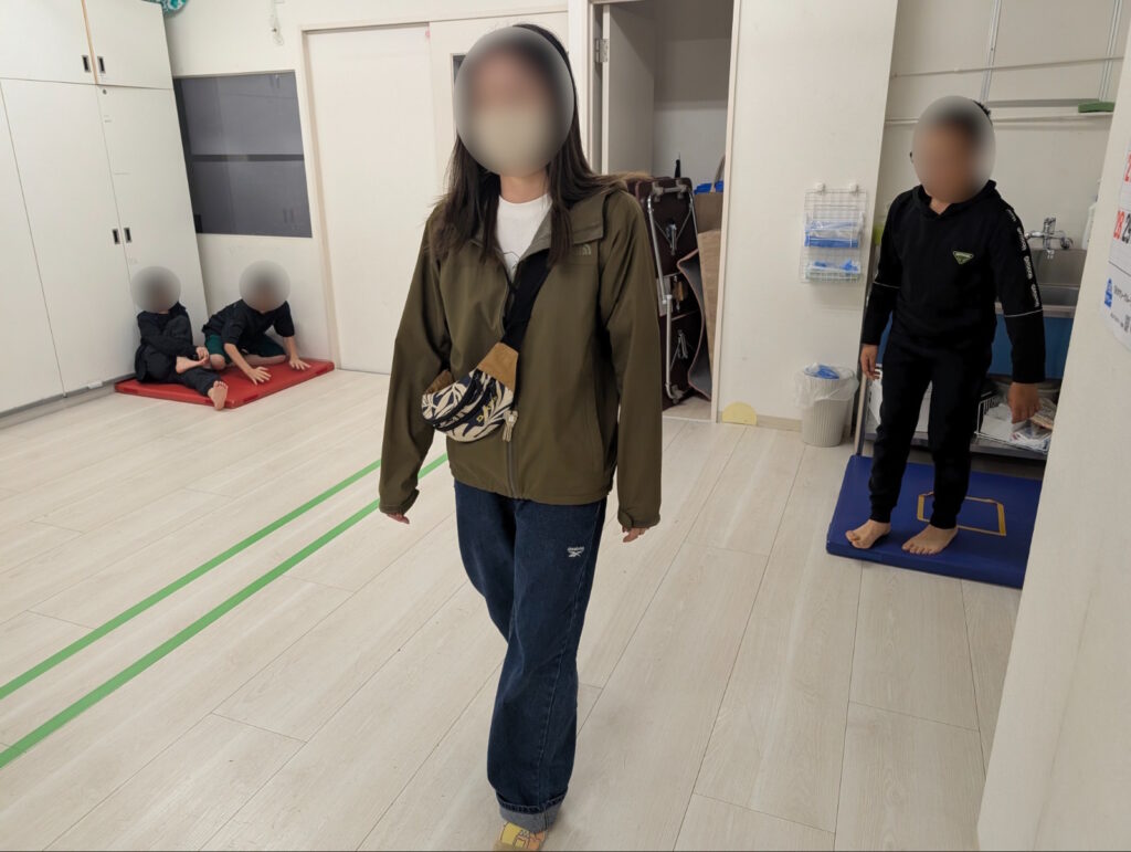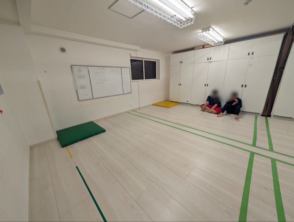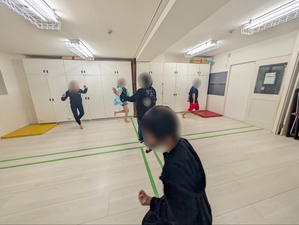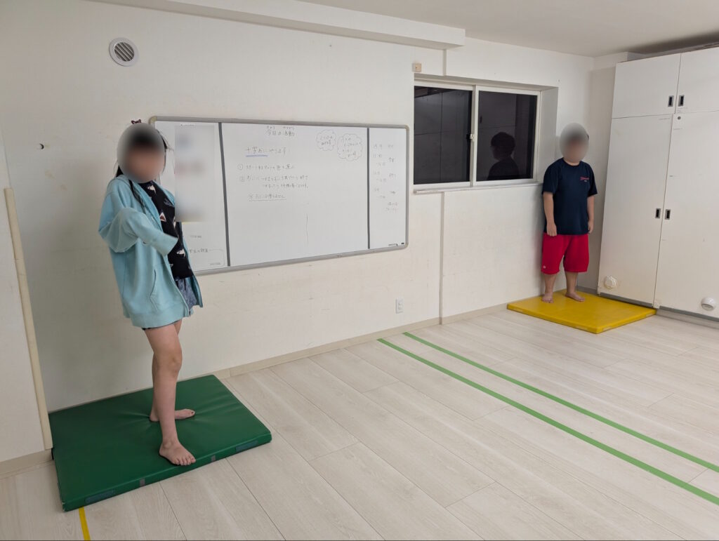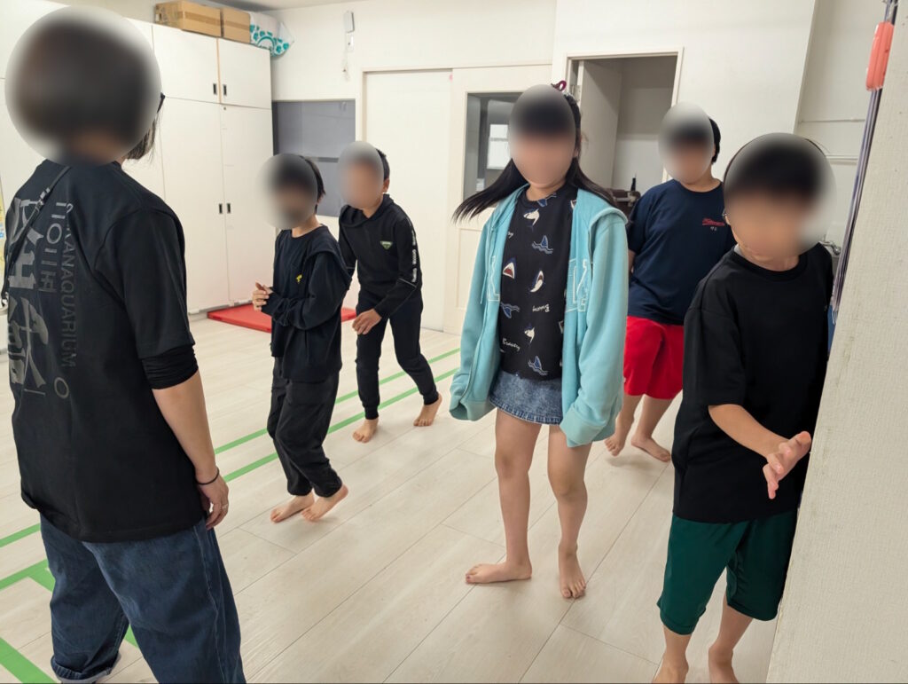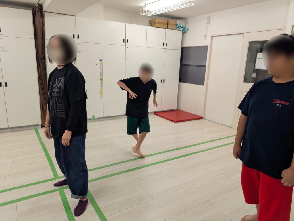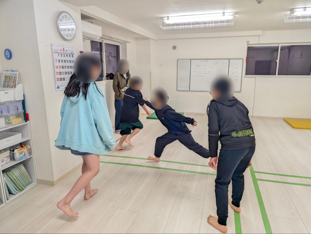 先生の説明を真剣に聞いているお友達。部屋には鬼の通り道として十字の線と、ゴールになる四色のマットがあります。